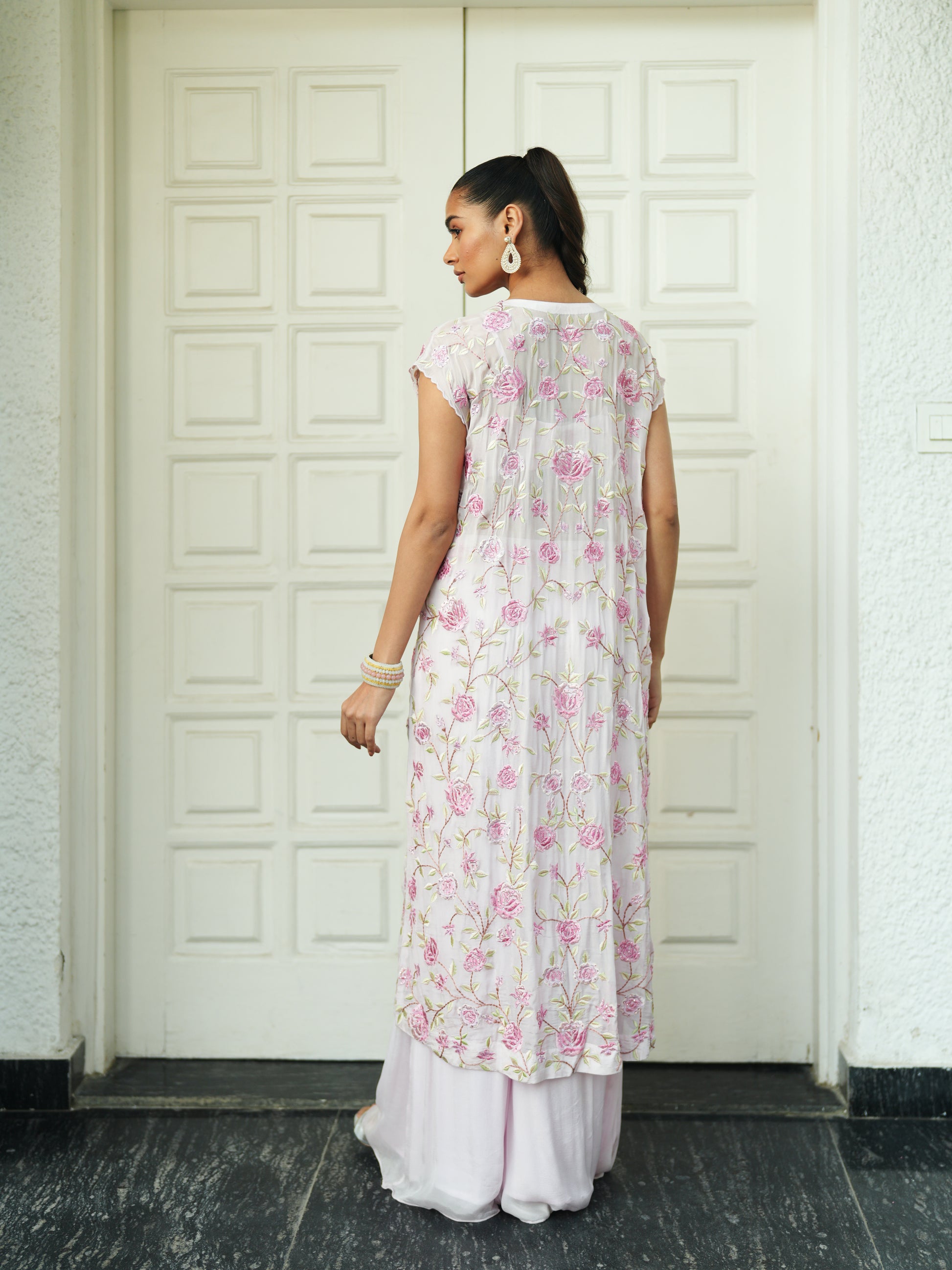 Elevate your style with our stunning floral crop top - pant set, perfect for any special occasion. The ensemble features a delicate baby pink floral crop top paired with a matching long cape. adorned with intricate embroidery. The soft pink pants add a touch of elegance, while the overall look is completed with a subtle yet sophisticated color palette.