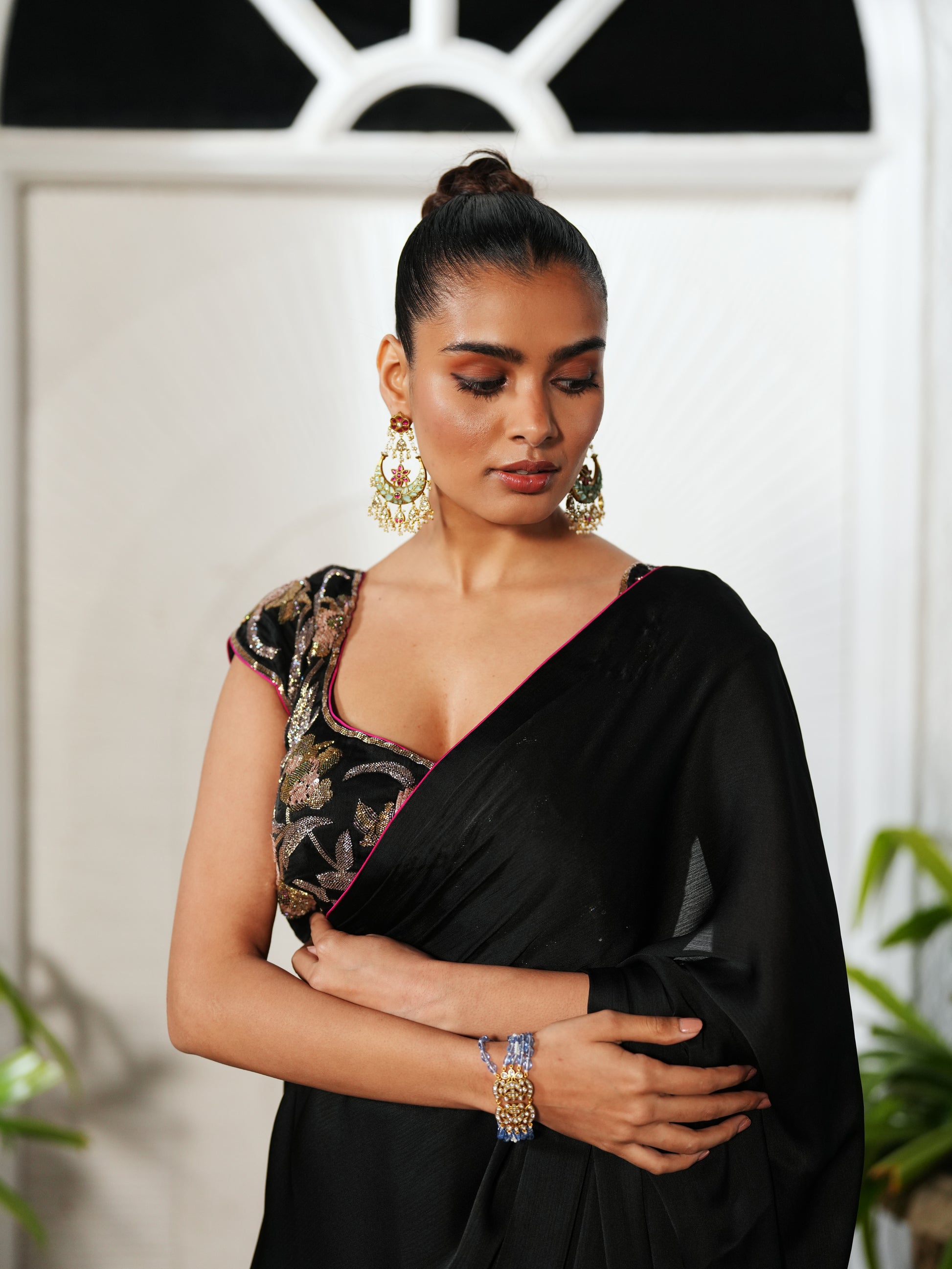 Our exquisite black saree is adorned with intricate handwork embellishments and a vibrant pink border. The handwork embellishments on the blouse add an extra layer of elegance, while the pink piping border on the saree adds a pop of color. Perfect for formal events or special occasions.