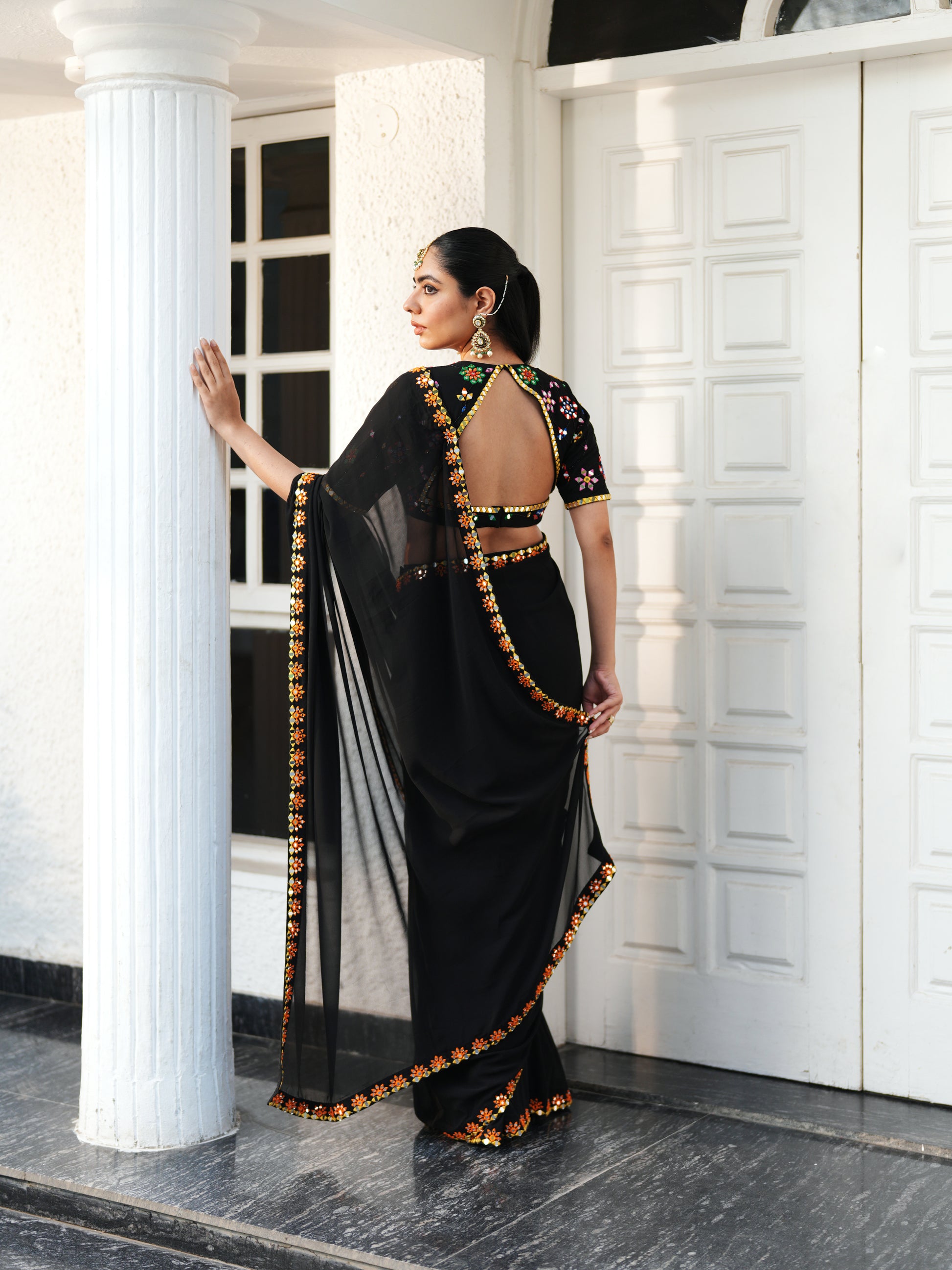 Black Georgette Pre-stiched Saree, beautifully adorned with exquisite mirror work surrounded by intricate multicolored thread work along the border and blouse, adds a touch of luxury. Perfectly paired with a matching embroidered blouse for a graceful, contemporary look.