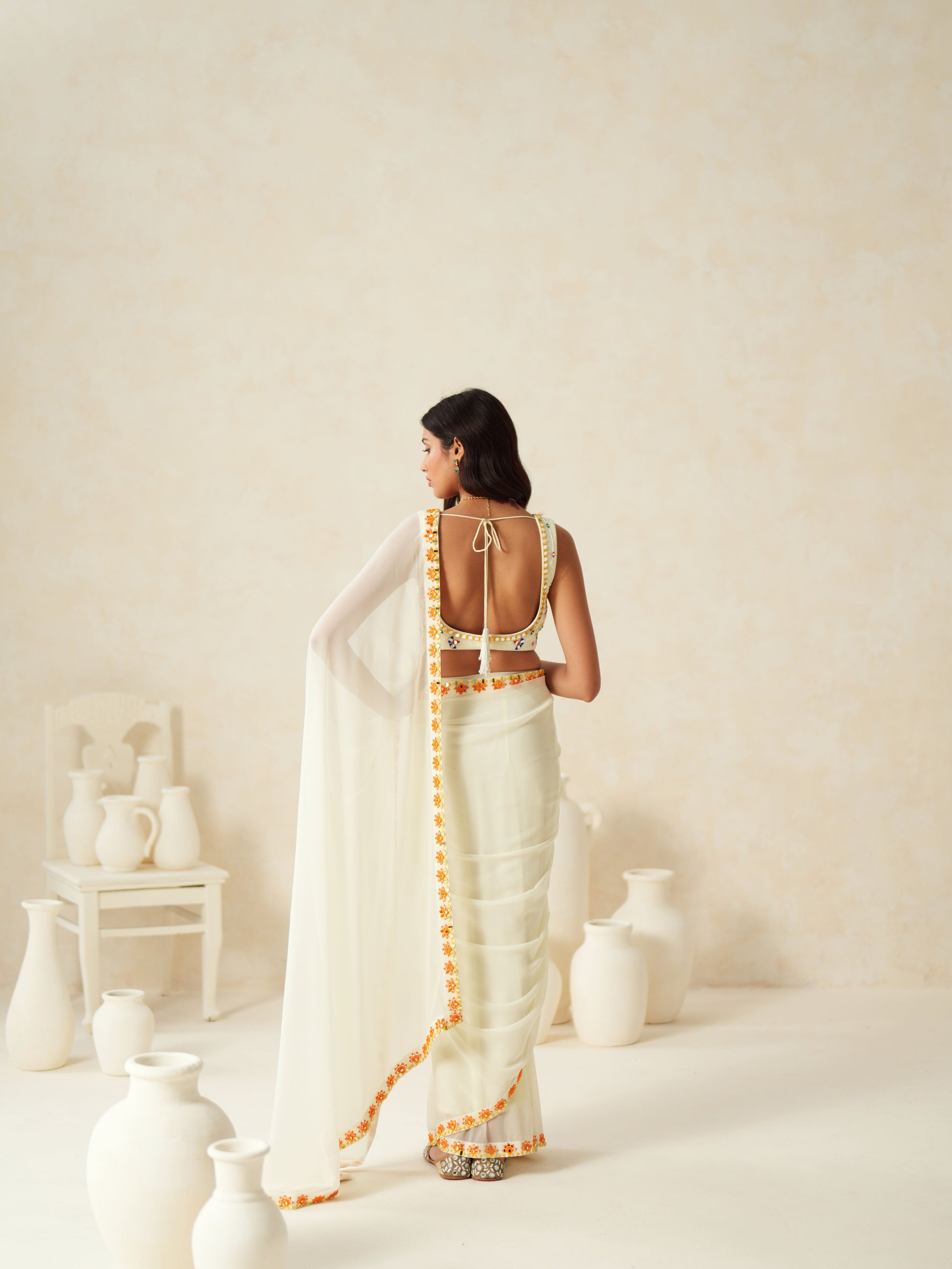 Ivory Georgette Mirror Work Pre-stitched Saree Set