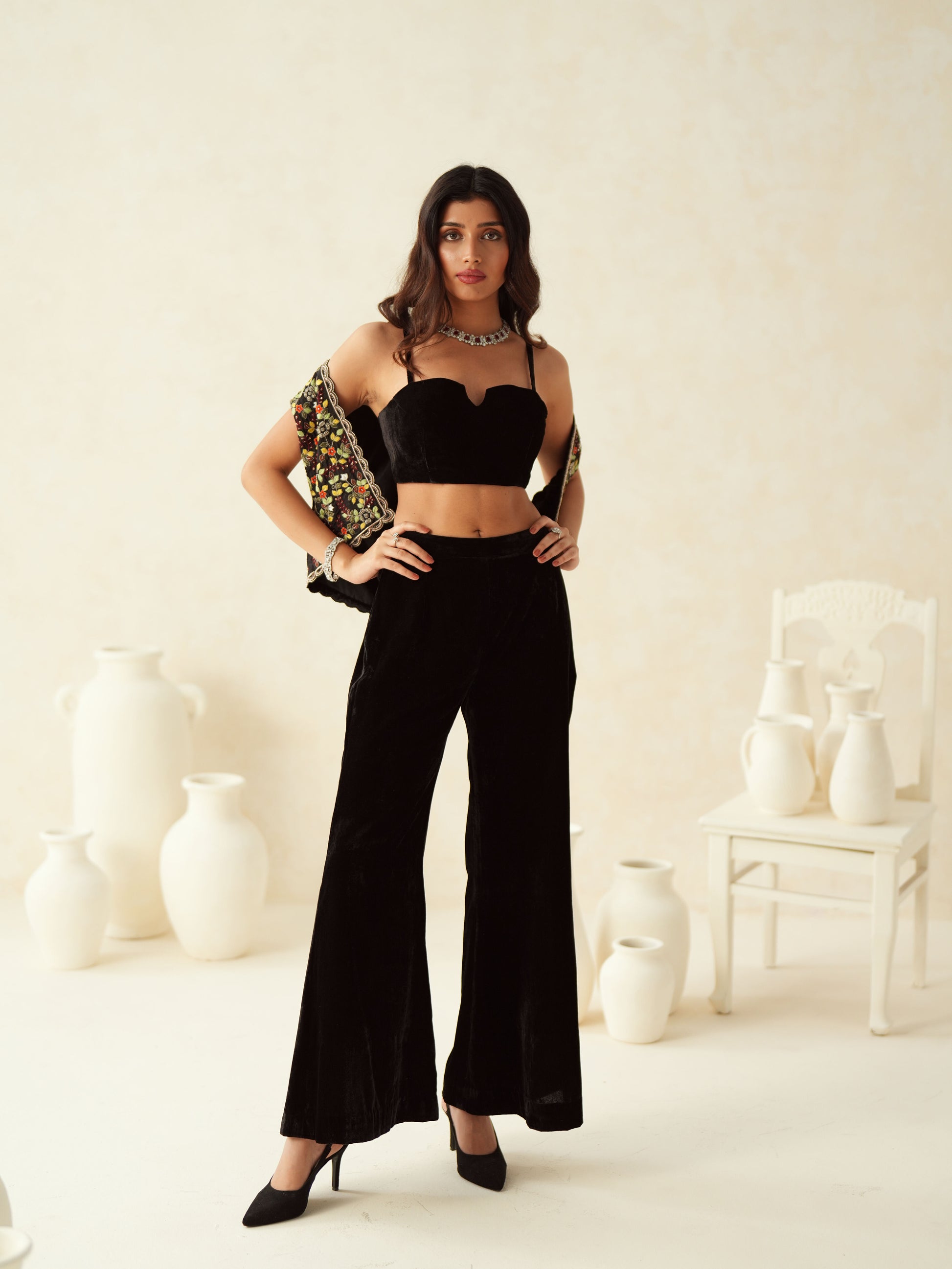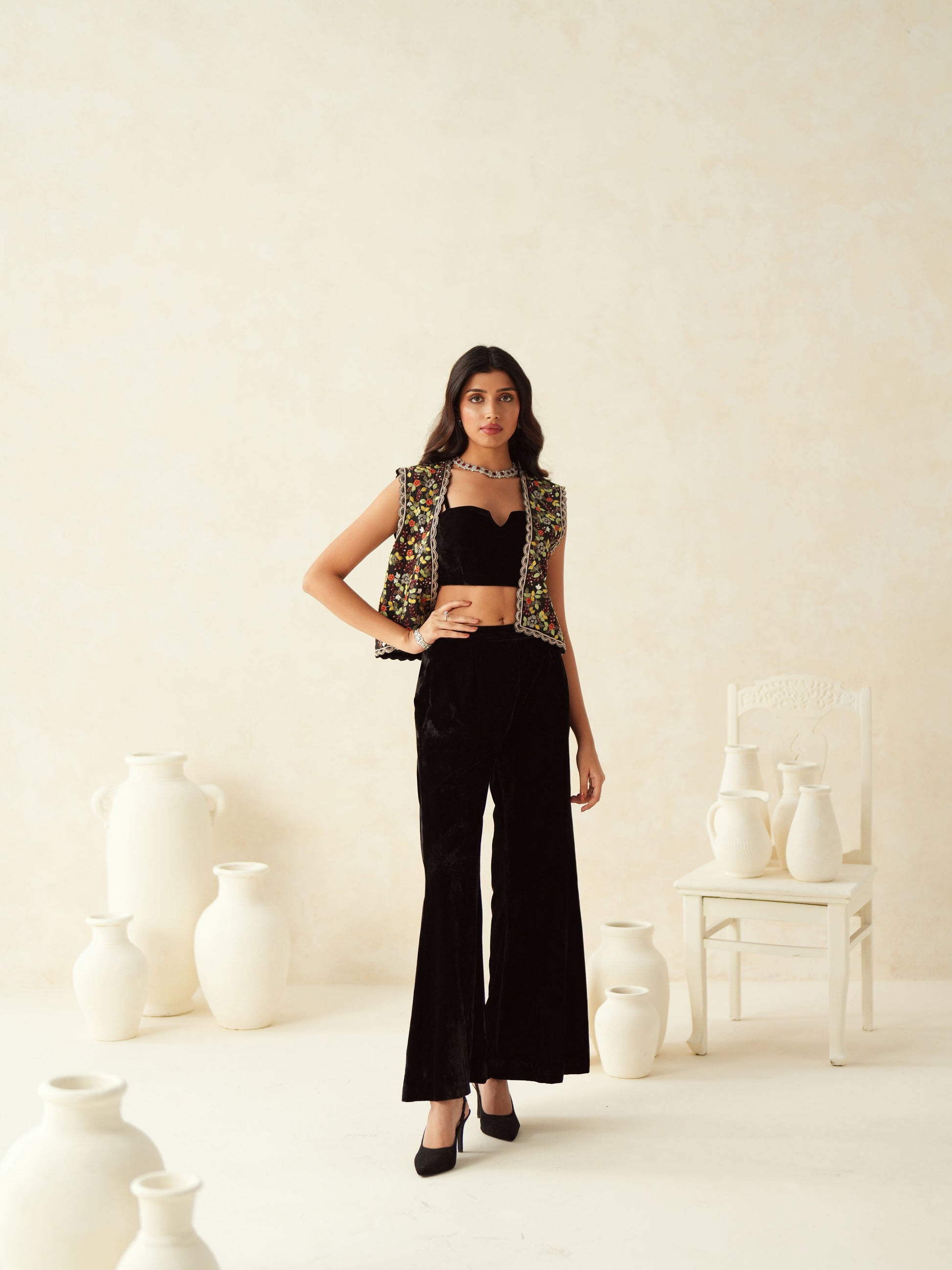 Elevate your style with this stunning black velvet Indo-Western outfit, featuring a crop top and flared pants paired with a show-stopping multicolored and embellished half silk jacket.
