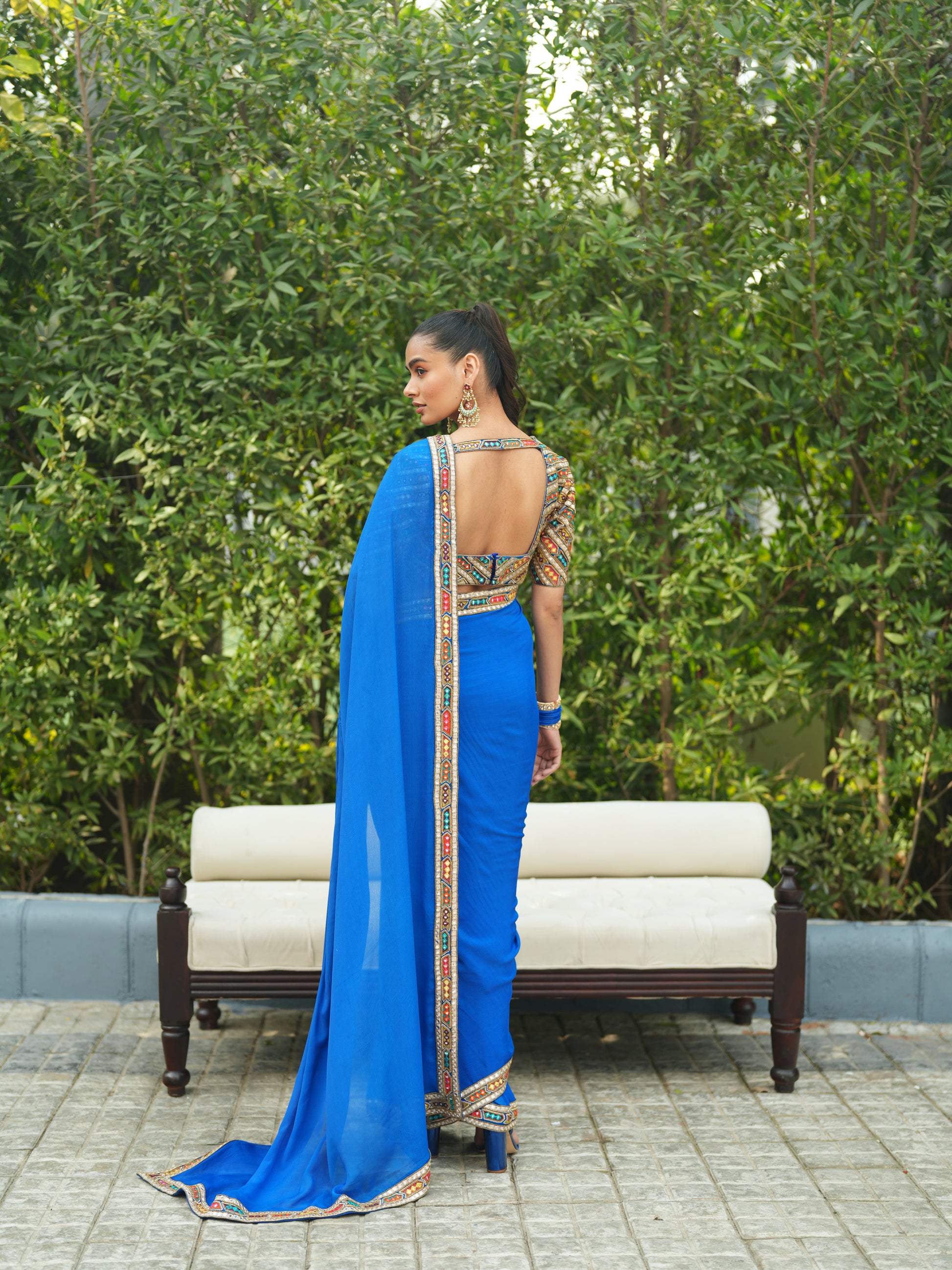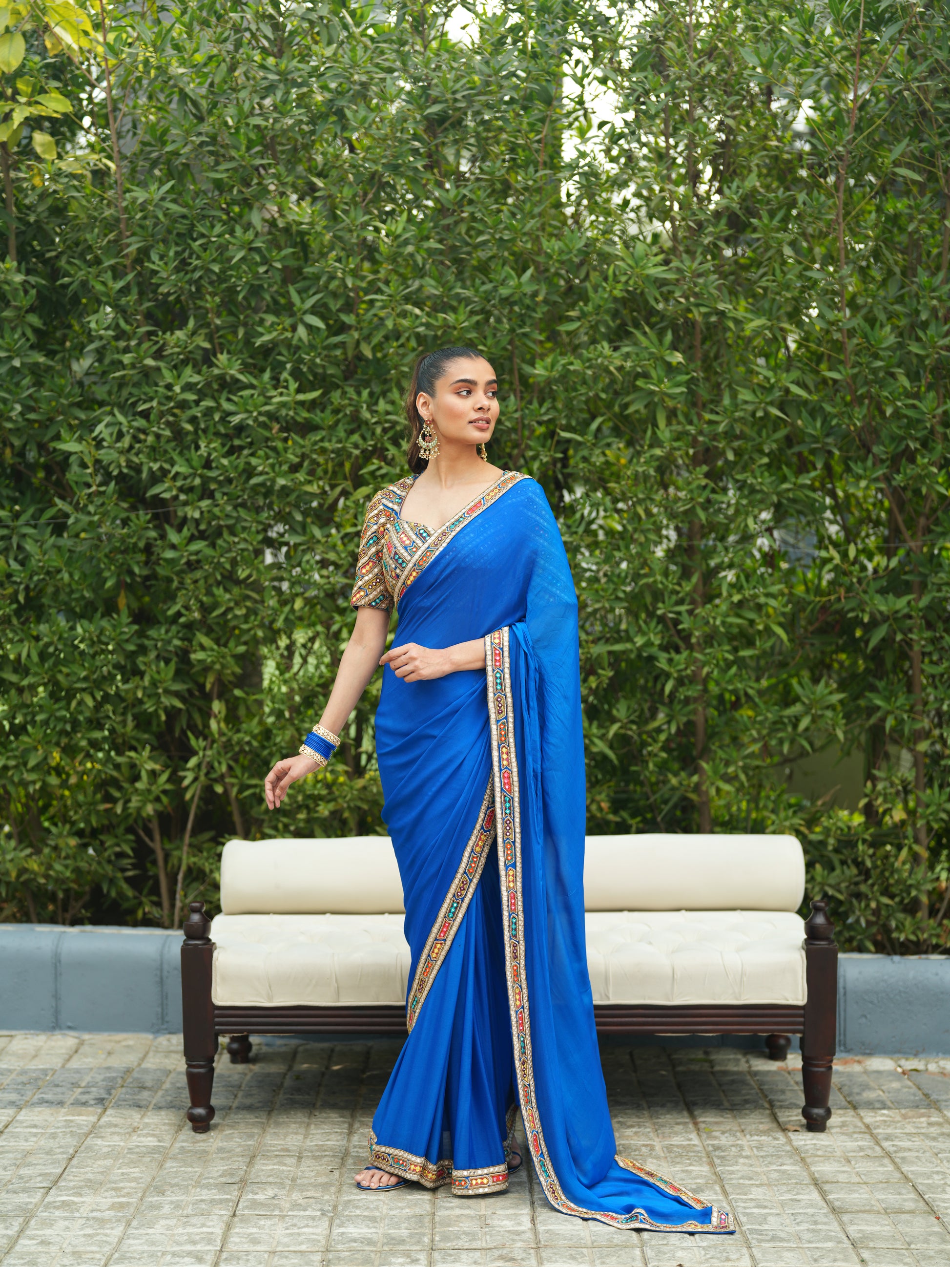 Our stunning vibrant blue chiffon saree showcases exquisite Indian handwork, featuring intricate multicolored embroidery, delicate mirror work, and traditional handwork. The saree's border shines with intricate geometric patterns, perfectly highlighting our karigar's skill and craftsmanship.