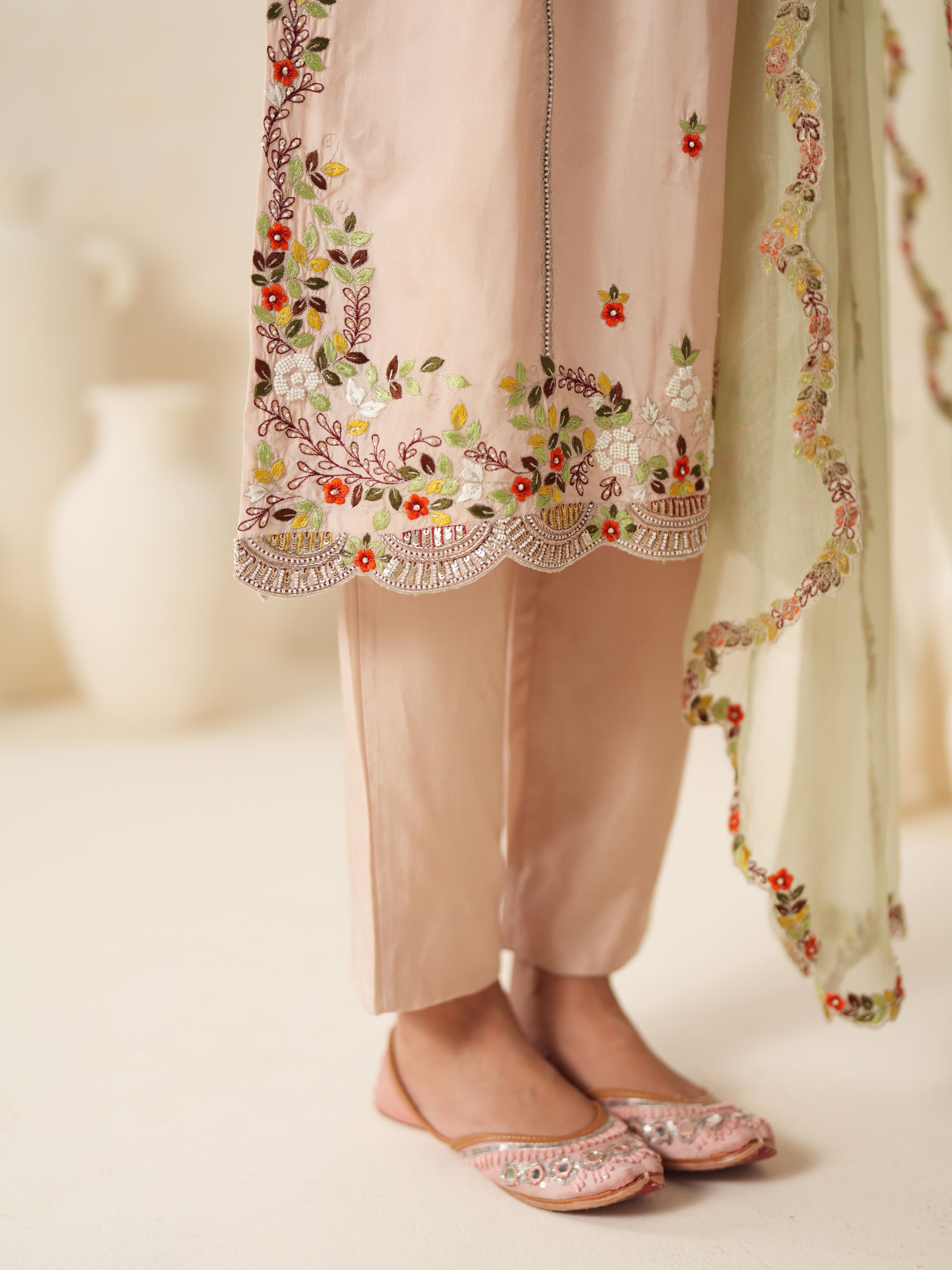 Our blush pink suit set is crafted from luxurious fabric, featuring intricate multicolor thread and handwork detailing. The mint green organza dupatta adds a touch of elegance to the overall look. This outfit is perfect for all kind of occasions and celebrations.
