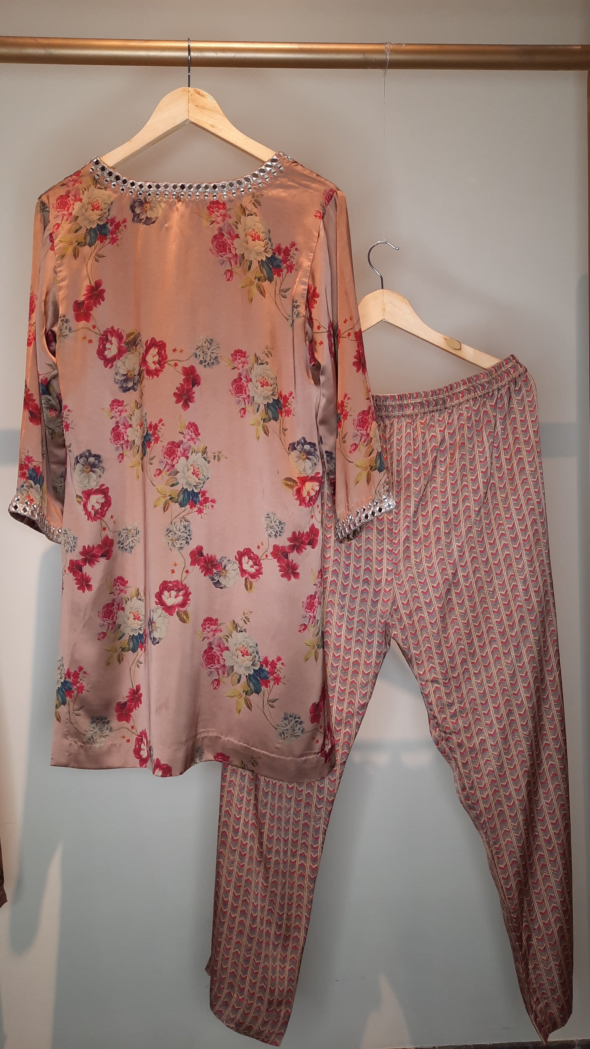 Elevate your ethnic style with our exquisite printed satin co-ord set, adorned with mirrorwork detailing borders. The intricate geometrical print on the pants adds a touch of sophistication and elegance to the overall look.