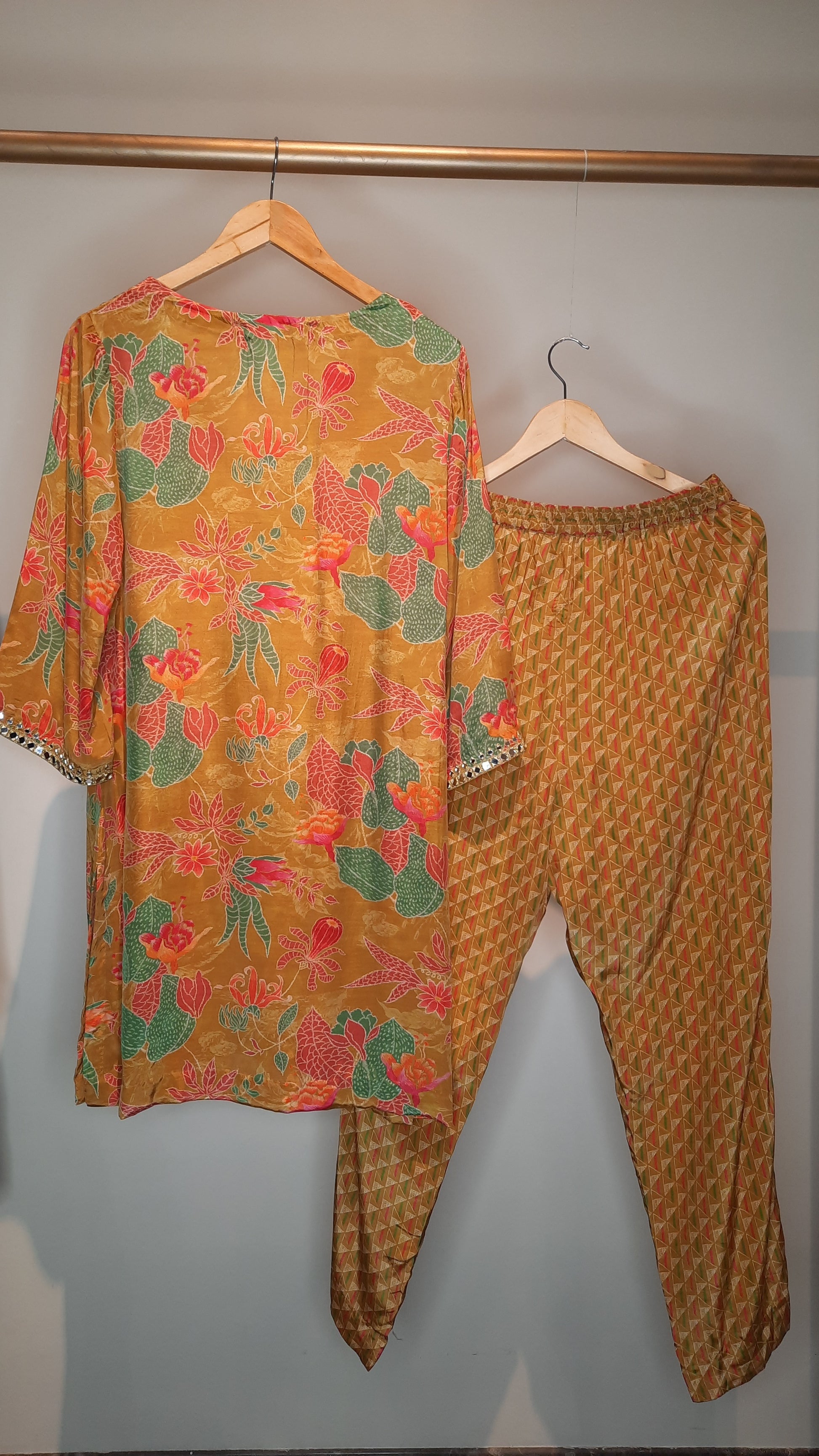 Elevate your style with our stunning golden printed crepe co-ord set, adorned with beautiful mirror work border on the neckline and sleeves making it suitable for women of all ages.