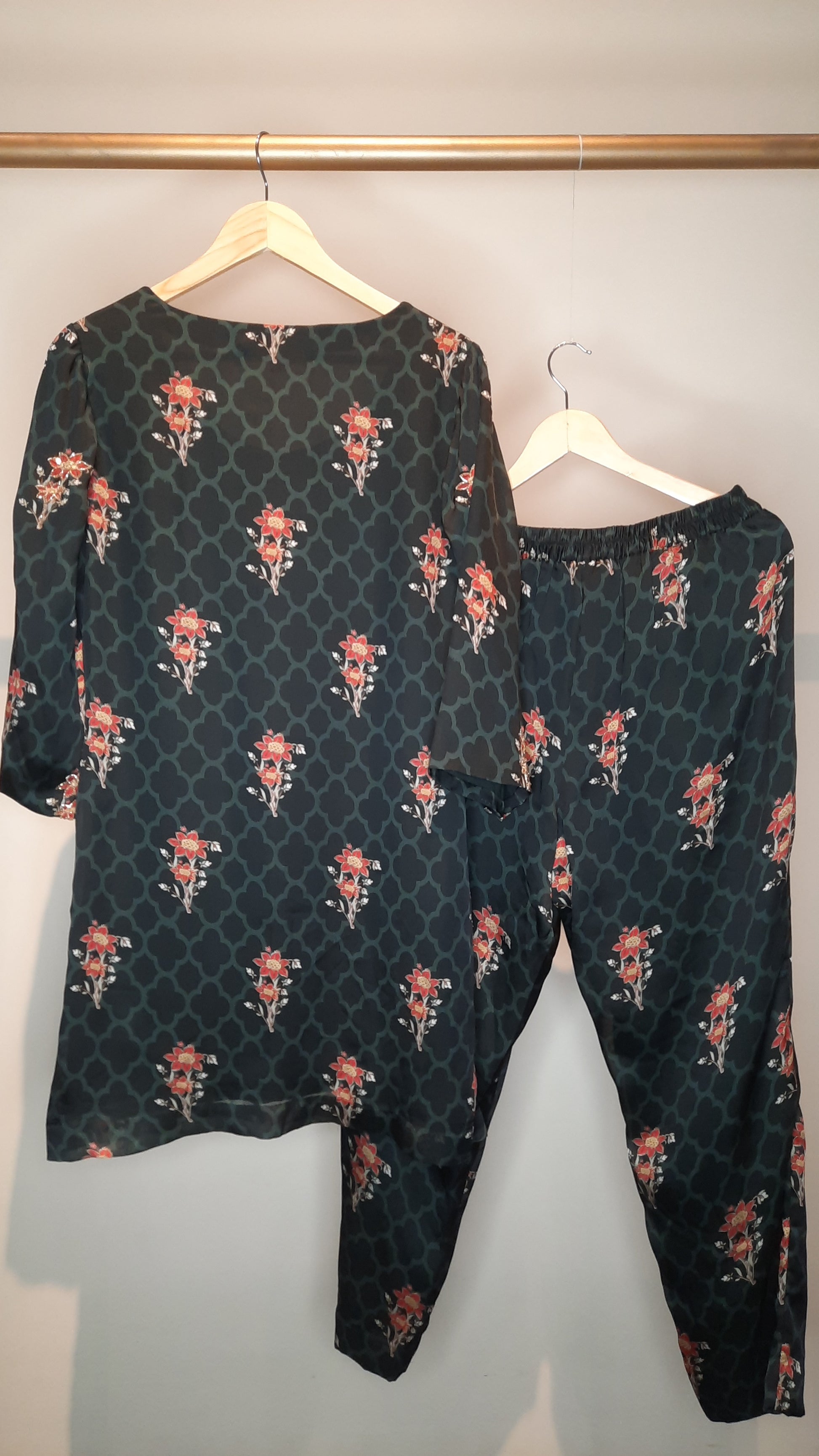 Our printed co-ord set is crafted from comfortable crepe fabric, ensuring a relaxed fit. The beautiful floral print adds a touch of elegance to the overall look adorned with beautiful embellished border on the neckline. Perfect for casual gatherings, parties, or special occasions, this set is suitable for women of all ages.